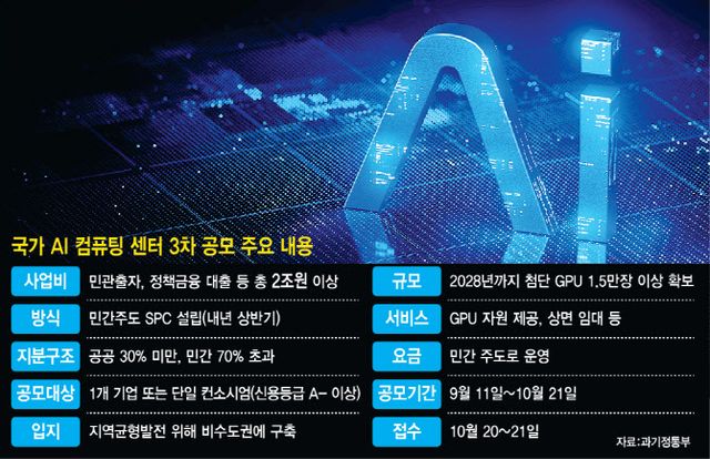 한편, 국가AI컴퓨팅센터는 민간 주도 특수목적법인(SPC)을 설립해 총 2조원 이상을 투입하는 초대형 프로젝트다. 2025년부터 2030년까지 단계적으로 추진되며, 2028년까지 GPU 등 첨단 AI 반도체 1만5000장 이상을 구축하고 2030년까지 추가 확충을 이어갈 계획이다. 이를 통해 이재명 정부가 내세운 ‘AI 고속도로’ 전략을 본격화한다는 구상이다. 일정은 다음달 21일까지 공모를 마무리하고, 연내 사업자를 확정한 뒤 2026년 상반기 SPC를 공식 출범하는 순서로 진행된다.