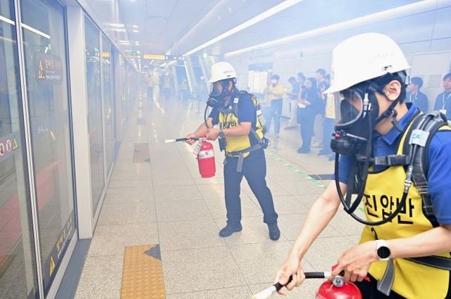 훈련은 열차 내 방화가 발생돼 승강장까지 번지는 상황으로 설정됐으며 화재 발견 및 초기 신고, 승객 대피 유도, 소방·경찰·철도운영기관 간 긴급 상황전파 이후 화재 진압과 인명 구조, 사후 수습 및 단계별 대응 절차를 점검했다.