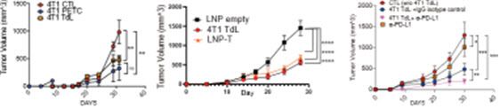 이어 신항원을 LNP에 담아 전달한 경우(LNP-T군)에서도 종양 크기가 유의하게 감소했으나(p<0.0001), 가장 강력한 억제 효과는 여전히 TdL군에서 확인됐다. 특히 TdL을 기존 면역항암제와 함께 사용했을 때는 면역항암제 단독 투여보다 종양 억제 효과가 뚜렷하게 향상됐다.