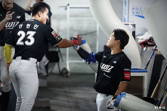 두 선수의 '내부 경쟁' 덕분이었을까. KT는 이들의 활약으로 11일 경기에서 대역전승을 했다. 0-4로 끌려가던 7회 선두타자 안현민의 안타로 물꼬를 튼 KT는 1-4에서 나온 대타 강백호의 적시타로 난공불락이었던 선발 요니 치리노스를 강판시켰다. 이후 바뀐 투수를 상대로 KT 타자들이 맹공을 퍼부으면서 역전승했다.