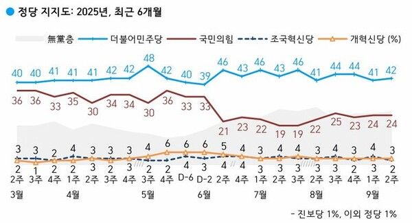 직전 조사(9월 첫째 주)와 비교해 민주당 지지율은 1%포인트 상승했고 국민의힘 지지율은 변동이 없었다.