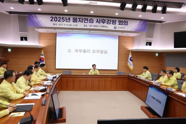 | ▲ 김민석 국무총리가 12일 세종대로 정부서울청사서 열린 을지연습 사후강평회의를 주재하고 있다. |