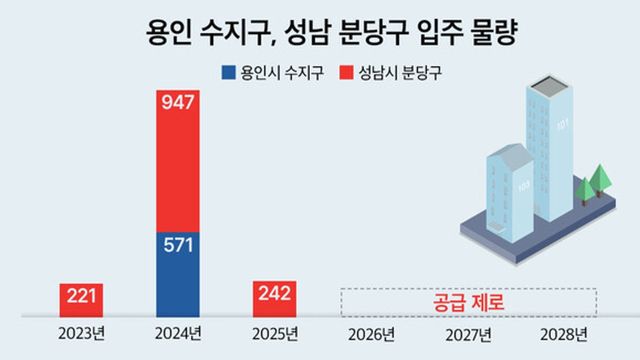 수지구는 지난 3년간 100가구 이상 신규 입주 단지가 거의 없으며 올해 입주 예정이었던 ‘e편한세상 죽전 프리미어포레’(430가구) 외에는 이렇다 할 신축 물량이 없다. 인접한 성남 분당구도 상황은 마찬가지로 분당 아테라(242가구)가 유일한 입주 단지다.