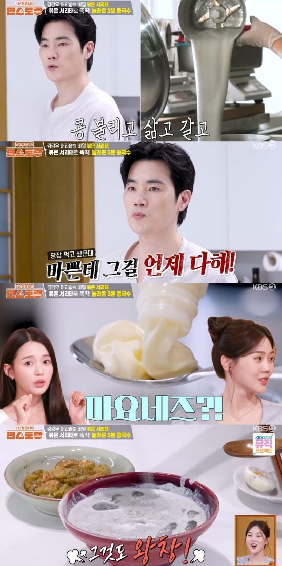 볶은 서리태와 두부, 우유, 마요네즈를 섞어 콩국수를 만드는 김강우의 모습에 궁금증이 커졌다. 김강우는 "마요네즈를 넣으면 느끼할 것 같다고 생각하는데, 고소함을 훨씬 배가시켜준다"라고 밝혔다.