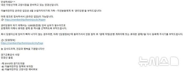 13일 도선관위 등에 따르면 지난달 29일 민 사장은 다수의 지인에게 "내년 지방선거에 고양시장을 준비하고 있는 민경선"이라며 "더불어민주당 온라인 입당은 8월31일까지이기에 가족·지인분들에게 꼭 '권리당원'을 부탁드린다"는 내용의 문자메시지를 보냈다.