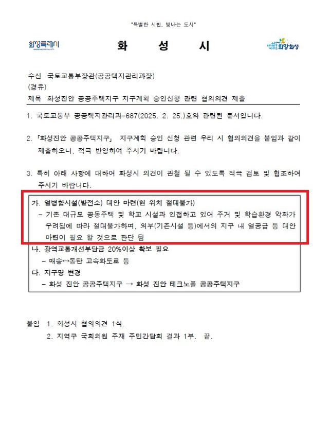 13일 경기 화성시에 따르면 국토부는 지난 11일 화성진안 공공주택지구 내 열병합발전시설 현 부지 계획을 철회, 주민 생활권과 주거환경 보호를 위해 대체부지를 재검토하기로 했다.