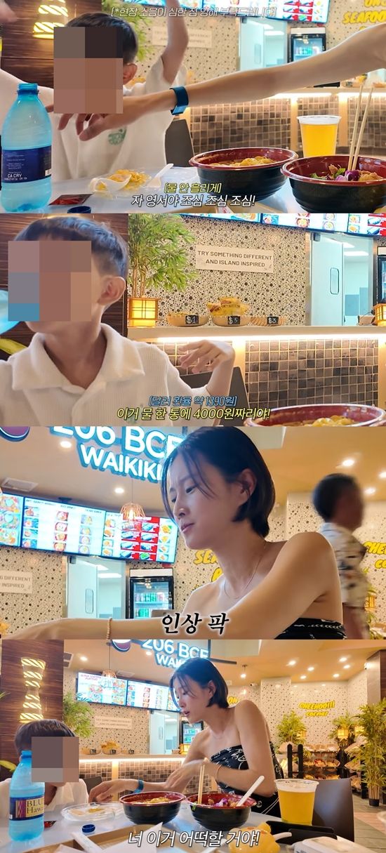 이현이는 남편에게 "물 2개에 5불이라고?"라며 가격을 물었다. 남편은 "5불 22. 비싸다. 이거 물 한 통에 4,000원짜리다. 알뜰히 멀어라, 하와이 물가 진짜 (비싸다)"라며 비싼 하와이의 물가에 충격을 받은 듯 혀를 내둘렀다.