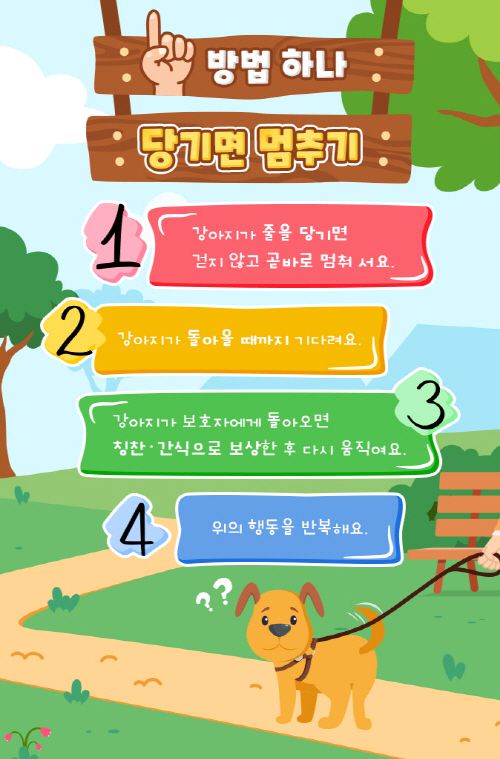 Step 1. 강아지가 줄을 당기면 곧장 방향을 틀어 반대쪽으로 걸어요.