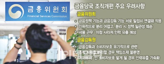 문제는 금융위 업무에서 정책과 감독 업무를 뚜렷하게 구분하기 어려운데다 이를 인위적으로 나누면 정책 일관성이 훼손될 수 있다는 점이다. 금융위의 핵심 과제인 가계부채 관리나 금융소비자 보호 이슈는 정책과 감독이 동시에 작용해야 하는 영역이다. 금융위 관계자는 “은행과나 보험과처럼 업권을 담당하는 업무는 정책과 감독이 다 섞여 있다”며 “이걸 분리하는 방법은 ‘제비뽑기’일 뿐이다”라고 답답한 심정을 드러냈다. 정부는 ‘엑셀(정책)’과 ‘브레이크(감독)’을 분리해 상호 견제 기능을 강화하자고 하지만 실무에서는 효과적인 분리가 어려워 결국 업무 혼선이 불가피하다는 우려가 제기된다.