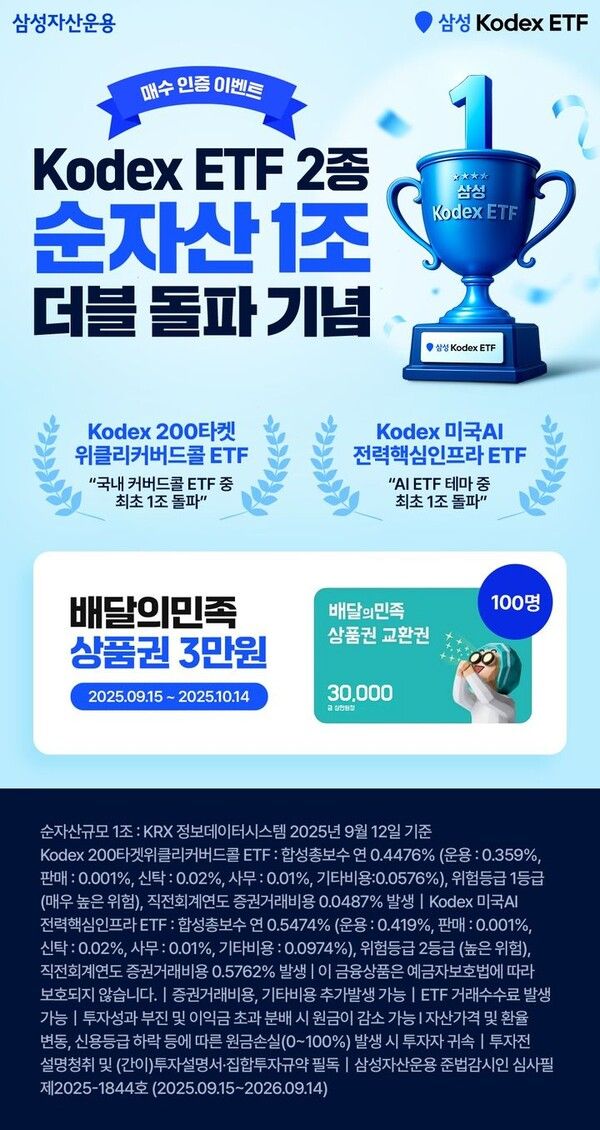 한편, 삼성자산운용은 해당 2종 ETF의 더블 돌파를 기념해 매수 인증 이벤트를 진행한다. 다음 달 14일까지 해당 2종 ETF 중 1종목을 1주 이상 매수하고 KODEX 홈페이지를 통해 인증하면, 추첨을 통해 배달의민족 상품권 3만원(100명)을 제공할 예정이다.