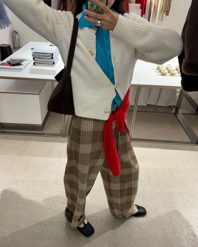 MZ 세대의 발랄한 감각을 드러내고 싶다면 인플루언서 박민주를 주목해 볼 것. 화이트 카디건에 쨍한 블루 피케 니트, 여기에 아가일 체크 패턴의 팬츠를 매치해 통통 튀는 스타일을 완성했다. 여기서 끝이 아니다. 키 포인트는 허리에 쫑긋 묶은 강렬한 레드 니트 톱. 이 한 끗 차이가 룩 전체에 발랄한 에너지를 불어넣은 결정적 포인트!
