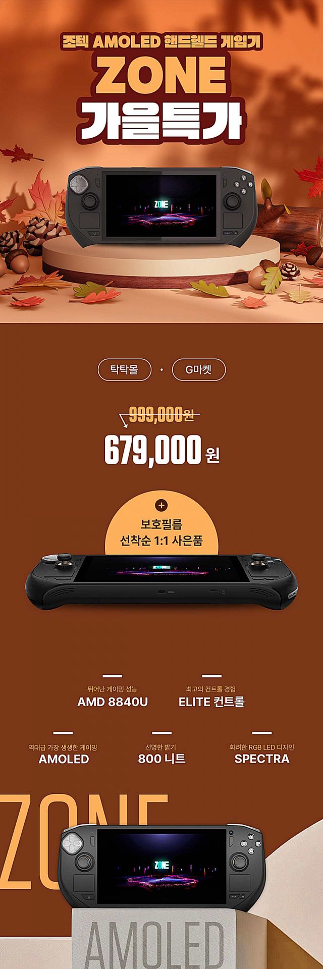 지포스 그래픽카드 전문 기업 조텍코리아가 OLED 핸드헬드 PC ZONE을 대상으로 가을맞이 할인 이벤트를 진행한다. 본 제품은 언제 어디서나 게임을 즐길 수 있도록 휴대성과 성능을 결합했으며, 7인치 FHD AMOLED 디스플레이를 탑재해 선명한 화질과 빠른 주사율을 지원한다. AMD Ryzen 7 8840U 프로세서와 RDNA 3 그래픽 아키텍처를 기반으로 안정적인 게이밍 성능을 구현한다.