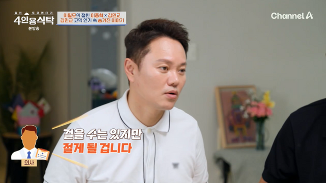 이날 이필모의 집을 찾은 김민교는 “공연 중 십자 인대가 끊어졌다. 공연 후 병원을 갔더니 앞으로 뛰지 못할 거고 걸어도 절게 될 거라고 했다”고 당시를 떠올렸다.