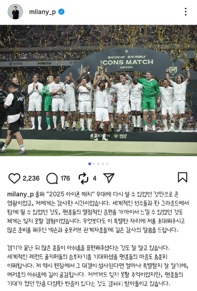 15일 저녁 박주호 전 축구선수는 자신의 사회관계망서비스(SNS) 계정에 “세계적인 레전드 골키퍼들의 승부차기를 기대했을 팬들의 마음을 충분히 이해한다”며 “저 역시 현장에서 그 대결이 성사됐다면 얼마나 특별했을지 잘 알기에 여러분의 아쉬움에 깊이 공감한다”고 적었다.