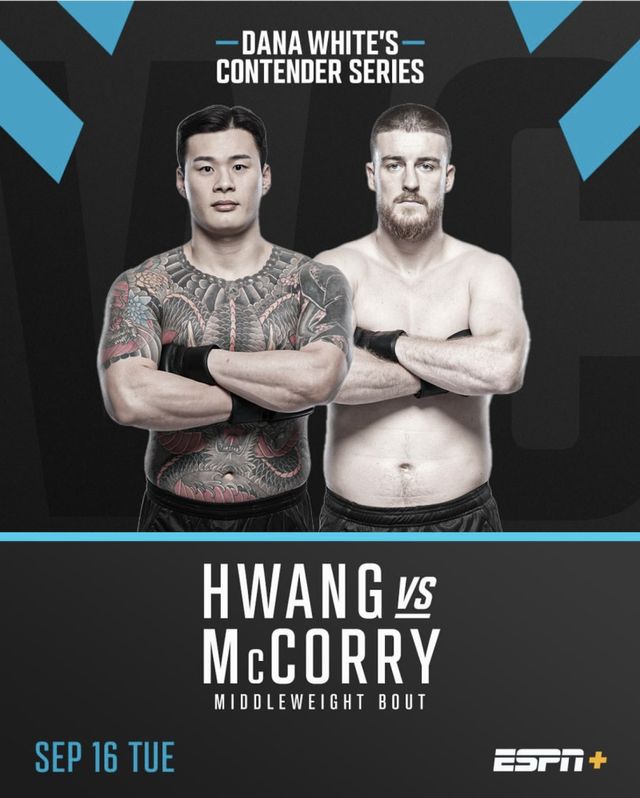 황인수는 17일(한국시간) 미국 라스베이거스 UFC 에이팩스에서 열리는 ‘데이나 화이트 컨텐더 시리즈(DWCS)’에서 패디 맥코리(아일랜드)와 미들급(83.9kg) 매치를 치른다.
