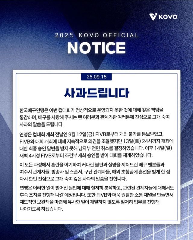 KOVO는 “이번 2025 여수·NH농협컵 프로배구대회(컵대회)가 정상적으로 운영되지 못한 것에 대해 깊은 책임을 통감하며, 배구를 사랑해 주시는 팬 여러분과 관계기관에 진심으로 고개 숙여 사과 말씀드린다”고 15일 밝혔다.