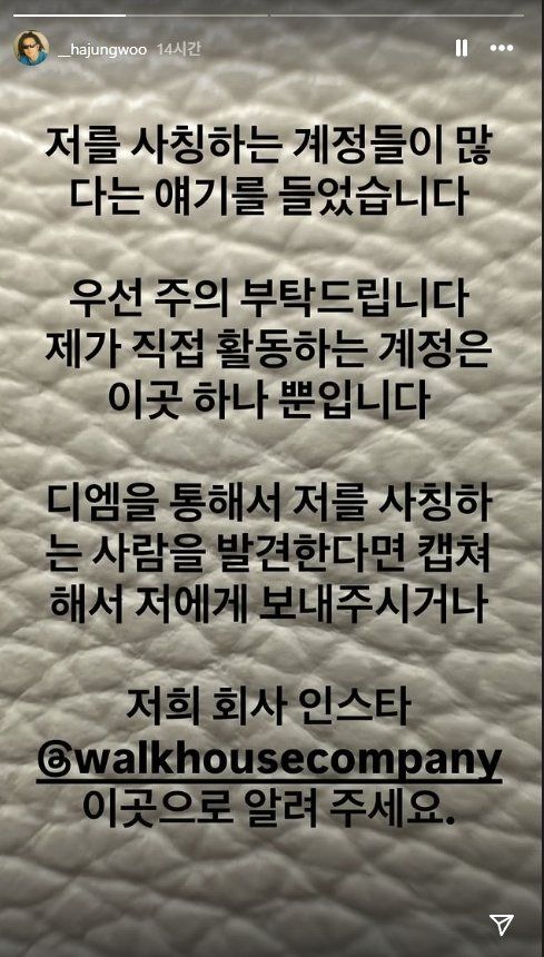하정우는 자신의 SNS에 “나를 사칭하는 계정이 많다는 이야기를 들었다. 우선 주의를 부탁드린다”며 “내가 직접 활동하는 계정은 하나 뿐”이라고 밝혔다.