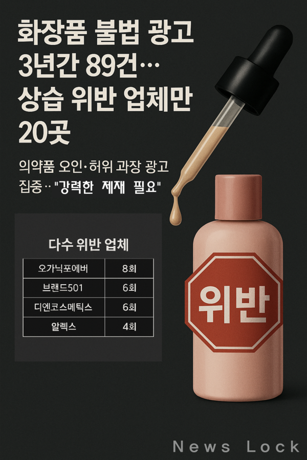 국회 보건복지위원회 소속 서미화 의원(더불어민주당·비례)이 16일 식품의약품안전처에서 제출받은 자료에 따르면, 2022년 이후 최근 3년간 화장품 표시·광고 위반으로 행정처분을 3회 이상 받은 업체는 20곳으로 집계됐다. 이들 업체가 적발된 횟수를 모두 합치면 무려 89건에 달한다.