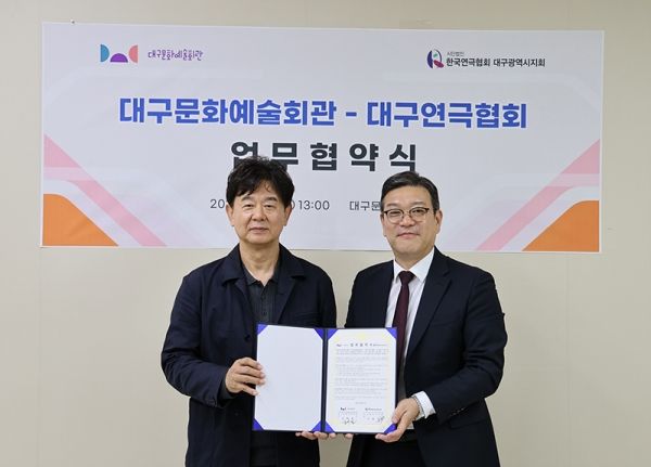 (재)대구문화예술진흥원 대구문화예술회관(관장 김희철, 이하 ‘대구문예회관’)은 대구연극협회와 업무협약(MOU)을 체결하고, 지역 연극 생태계 강화와 지속 가능한 성장 기반 마련을 위해 협력하기로 했다.