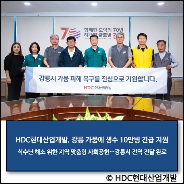 HDC현대산업개발(294870, 이하 HDC현산)은 최근 가뭄으로 식수난을 겪고 있는 강릉시 주민들을 위해 생수 10만 병을 긴급 지원했다고 15일 밝혔다. 지원된 생수는 강릉시자원봉사센터를 통해 강릉시 전역에 배포된다.
