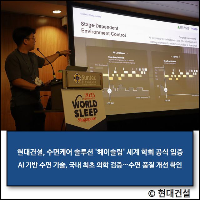 현대건설(000720)의 인공지능(AI) 기반 수면케어 솔루션 '헤이슬립(Hey, Sleep)'이 국제 수면학회에서 수면 개선 효과를 공식 입증했다고 16일 밝혔다. 이 솔루션은 슬립테크 스타트업 '에이슬립'과 공동개발됐다.