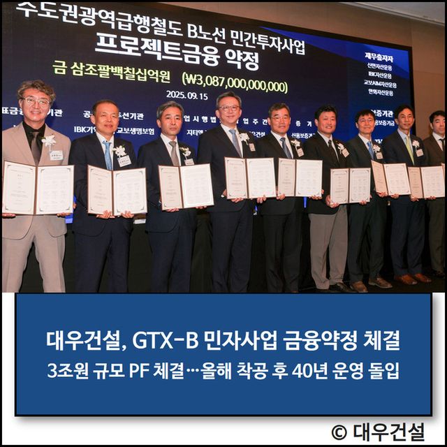이번 약정은 지난 8월 착공 이후 본격적인 사업 추진의 재무적 기반을 마련한 것으로 평가된다. 대우건설은 GTX-A 시공 경험과 메가 프로젝트 수행 노하우를 바탕으로 GTX-B의 적기 준공을 목표로 하고 있다.