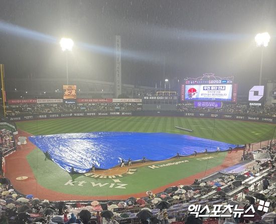 포수 강현우와 투수코치가 마운드를 방문한 사이 전부터 조금씩 내리던 빗줄기가 갑자기 굵어졌다. 오후 7시16분 우천으로 경기가 중단됐고, 1시간 44분 간의 기다림 끝에 오후 9시 경기가 재개됐다.