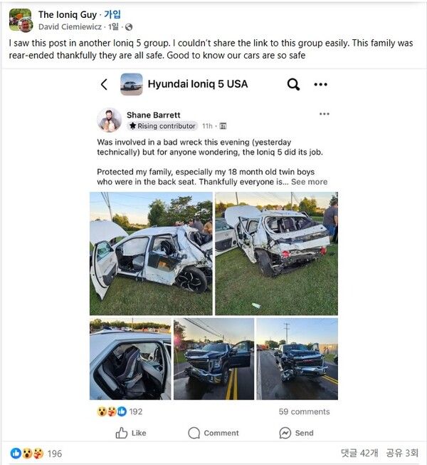 지난달 '셰인 배럿(Shane Barrett)'이라는 SNS 이용자가 본인이 직접 겪은 후방 추돌 사고에서 아이오닉 5가 18개월 쌍둥이를 지켜냈다는 소식을 공유해 화제가 된 바 있다.