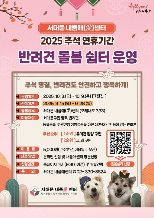 이성헌 구청장은 “반려견 걱정 없이 편안하게 명절 연휴를 보내실 수 있도록 이 서비스를 마련했으며 앞으로도 반려동물과 사람이 함께 행복한 서대문구를 위해 다양한 지원사업을 이어가겠다”고 말했다.