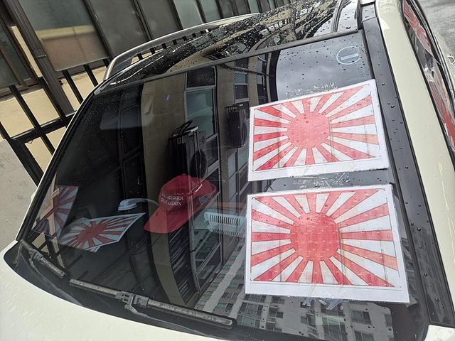 공개된 사진 속 벤츠 GLK 차량에는 일본 제국주의 군기를 상징하는 욱일기가 차량 전면 외부에 2장, 내부에 2장, 왼쪽 측면에 6장, 후면에 2장이 덕지덕지 붙어 있었다. 차량 내부에는 ‘MAKE AMERICA GREAT AGAIN(미국을 다시 위대하게)’ 문구가 적힌 트럼프 당시 후보의 대선 구호 모자도 눈에 띈다.