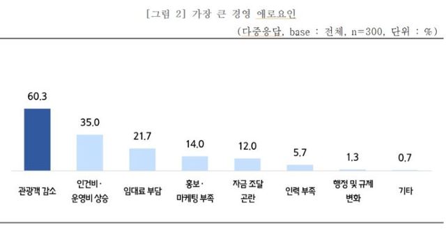 조사 결과 관광업계가 가장 큰 경영 애로 요인으로 꼽은 '관광객 감소' 응답률은 60.3%였다. 이어 '인건비·운영비 상승'(35%), '임대료 부담'(21.7%), '홍보·마케팅 부족'(14%), '자금 조달 곤란'(12%) 순으로 나타났다.