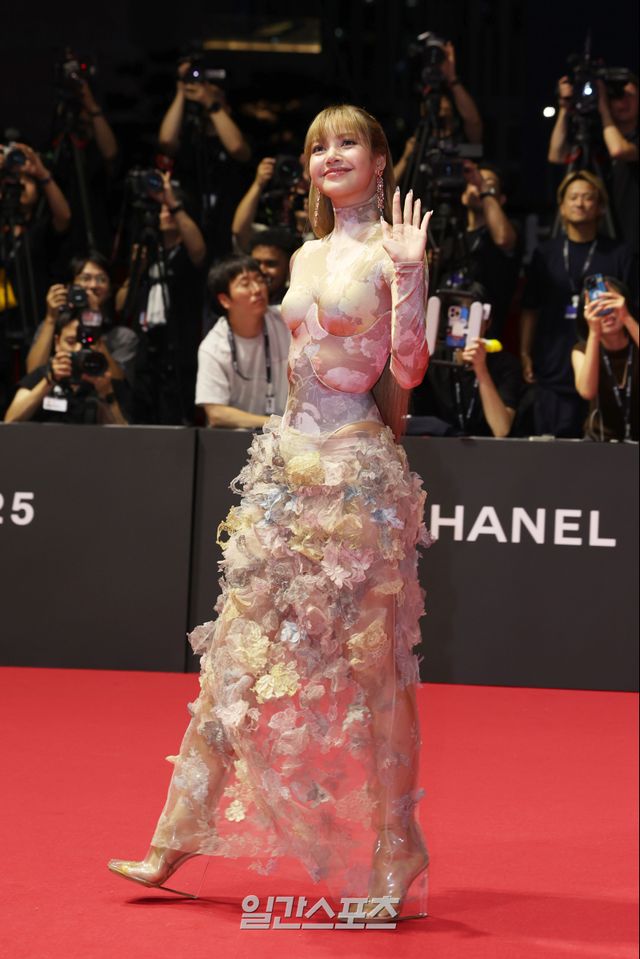 이날 레드카펫에서 가장 뜨거운 호응을 이끈 이는 블랙핑크 리사였다. 초청작도 예고도 없이 나타난 블랙핑크 리사는 플로럴 패턴이 우아하게 수놓인 시스루 맥시 드레스로 시선을 압도했다. 바디라인을 따라 밀착된 슬림핏 보디스와 풍성하게 흘러내리는 시어 스커트의 조화로 몸매를 부각했다.