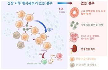 또한 면역반응 분석에 따르면, 거주 대식세포 결핍군의 신장에서는 CD8+ T세포가 과도하게 활성화되어 CCL5 단백질 발현이 증가하고, 이 단백질과 결합하는 NK 세포가 신장으로 대량 침투해 염증과 손상에 취약한 환경을 조성했다.