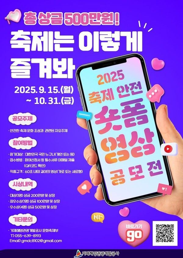 거제해양관광개발공사(사장 지영배)가 시민과 함께하는 안전한 축제 문화 확산을 취지로 ‘2025년 축제 안전 숏폼 영상 공모전’을 연다고 17일 밝혔다.
