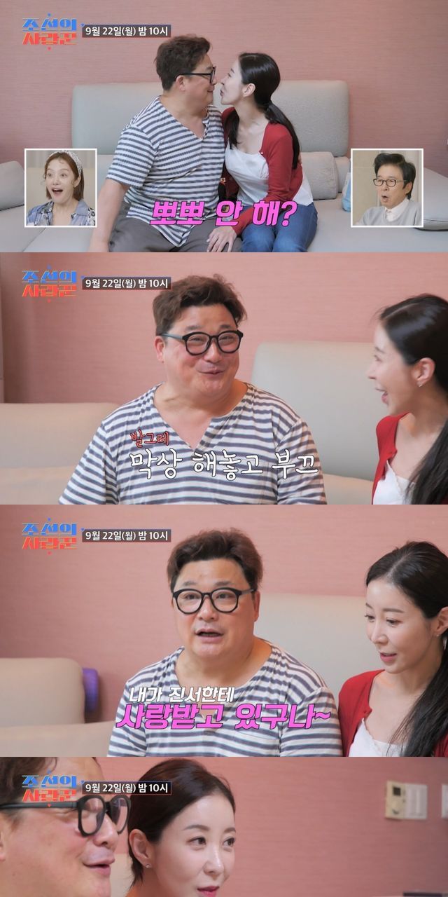 윤정수는 카메라 앞에서 망설이는 원진서에게 "드루와"라며 연상의 카리스마를 선보였다. 막상 원진서가 뽀뽀하자, 윤정수는 새빨개졌고 이를 VCR로 지켜보던 황보라는 "근데 얼굴은 왜 빨개지냐"면서 두 사람의 풋풋한 애정 행각에 아우성을 날렸다. 두 번째 뽀뽀가 이어지자, 제작진은 "원래도 뽀뽀를 자주 하시냐"고 질문했다.