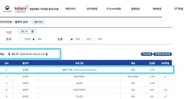 방송통신위원회 방송콘텐츠 가치정보 분석 시스템 RACOI에 따르면, 임영웅은 9월 2주(9월 8일~9월 14일) 인터넷 반응 분석에서 SBS ‘섬총각 영웅’으로 예능 출연자 전체 1위에 올랐다. 2위는 MBN ‘전현무계획 2’의 전현무, 3위는 SBS ‘런닝맨’의 김종국이었다.