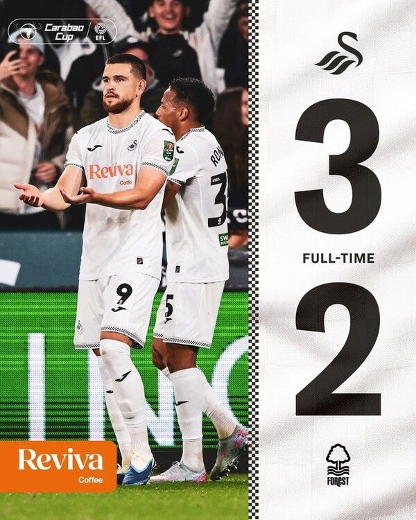 뉴시스 보도에 따르면, 스완지는 18일(한국 시간) 영국의 스완지닷컴 스타디움에서 열린 2025~2026시즌 리그컵(카라바오컵) 3라운드에서 노팅엄에 3-2 짜릿한 역전승을 거뒀다.
