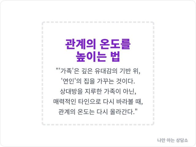 ‘가족’이라는 말은 관계의 종착역이 되어서는 안 된다. 그것은 깊은 유대감이라는 튼튼한 기반 위에, ‘연인’이라는 이름의 집을 계속해서 가꾸고 수리해야 한다는 의미다.