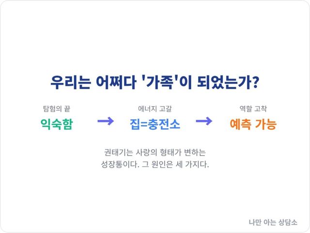 처방에 앞서 진단이 먼저다. 우리는 왜, 어떻게 ‘가족’이 되어버리는가? 권태기는 사랑이 식어서라기보다, 사랑의 형태가 변하면서 나타나는 자연스러운 성장통에 가깝다. 그 원인은 대개 세 가지다.