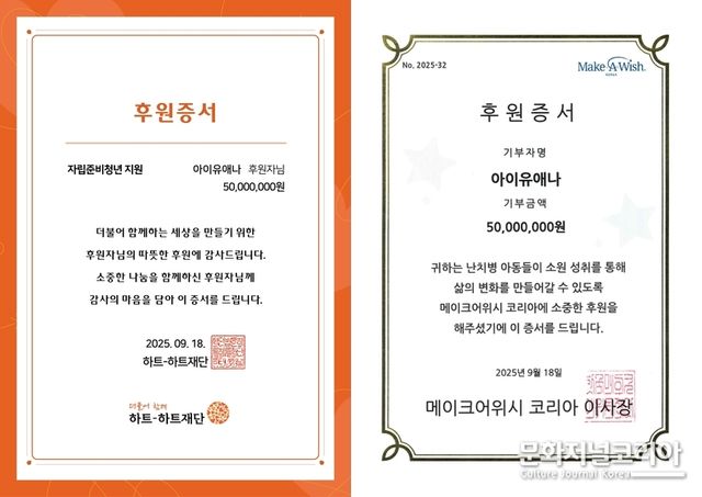 아이유는 데뷔 기념일, 자신의 생일, 연말연시 등 매해 뜻깊은 날마다 ‘아이유애나’ 이름으로 꾸준 히 기부하며 선한 영향력을 전해왔다. 올해 3월에는 경상권 일대의 대형 산불 피해 지원과 소방 관의 처우 개선을 위해 2억 원을 기부했고, 어린이날에는 아동·청소년을 위해 1억 5천만 원 기부, 생일에는 취약 계층을 위해 2억 원을 기부하며 따뜻한 나눔을 실천한 바 있다.