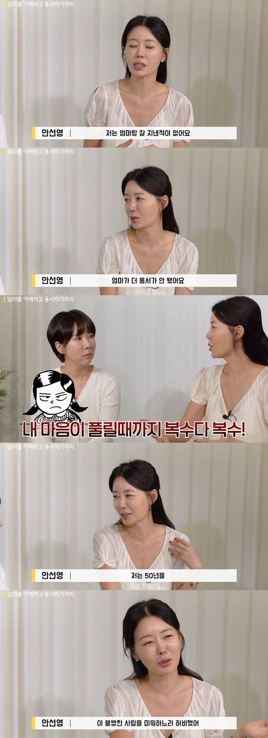 안서영은 "이해는 가지만 용서는 안 됐던 게 사실이다. 어렸을 때 이 사람이 나한테 했던 끊임없는 화풀이를 되갚아주면서 풀고 있다고 생각했다"라며 "엄마가 이미 치매 판정을 받으신 지는 7년이 넘으셨다. 빨리 용서를 했으면 쉬웠을 텐데 작년에 뇌졸중으로 내 눈앞에서 쓰러지는 걸 보고 나서야 (엄마가) 너무 불쌍했다"라고 말했다.