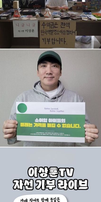 이상훈은 방송 활동 외에도 따뜻한 나눔을 실천하며 사회에 긍정적인 메시지를 전하고 있다. 자신의 소장품인 피규어와 장난감을 통한 자선 경매 수익금을 기부하는 등 취미를 기부와 연결해 선행을 이어오며, 2019년부터는 매년 어린이날마다 백혈병·소아암 환아를 위한 기부를 꾸준히 실천하고 있다. 이 외에도 농어촌 재능기부 공연 등 다양한 방식으로 나눔의 반경을 차근차근 확장해 가고 있다.
