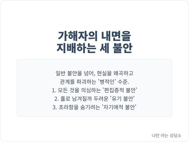 누구나 불안을 느낀다. 하지만 가해자의 불안은 정상적인 범주를 넘어, 현실을 왜곡하고 관계를 파괴하는 ‘병적인’ 수준에 이른다. 그의 내면을 지배하는 불안은 주로 세 가지 얼굴을 하고 있다.