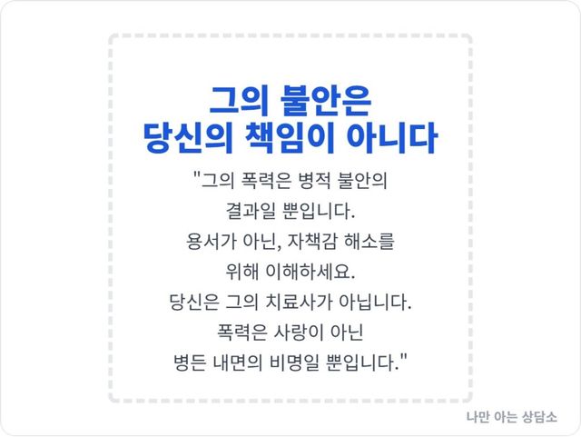 그의 폭력이 병적인 불안에서 비롯되었다는 사실을 이해하는 것은, 그를 용서하기 위함이 아니다. 그것은 당신을 옭아매던 끝없는 자책감에서 벗어나기 위함이다. 그의 불안의 원인은 당신이 아니다. 당신은 그저, 그의 불안이 투사된 스크린이었을 뿐이다.