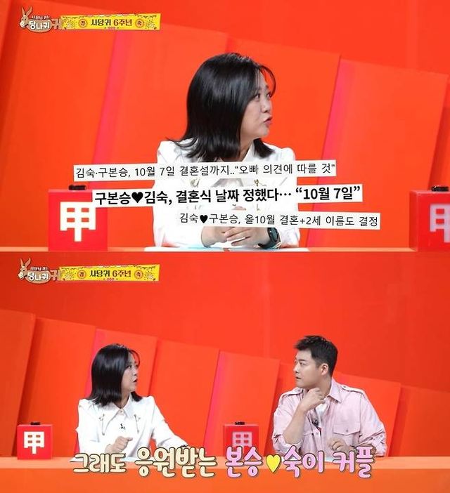 김숙이 방송에서 '결혼'에 대한 간절한 바람을 드러내고, 시술 계획까지 언급한 데 이어, 절친 송은이가 "본승이가 숙이를 너무 귀여워하더라"는 증언을 내놓으면서 결혼설에 무게가 실렸다. 결정적으로 불을 지핀 것은 KBS 2TV '사장님 귀는 당나귀 귀'. 김숙이 MC로, 구본승이 스페셜 MC로 출연한 방송에서 "10월 7일 결혼"이라는 발언이 나오면서 두 사람을 둘러싼 관심은 최고조로 치달았다.