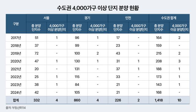 실제로 2017~2024년 사이 수도권에서 분양한 1418개 단지 가운데 4000가구 이상 대단지 분양은 전체의 0.7% 수준인 10곳에 불과하다. 가장 최근에 분양한 4000가구 이상 대단지는 2023년 10월 서울 동대문구에서 분양한 ‘이문아이파크자이(4321가구)’뿐이다.