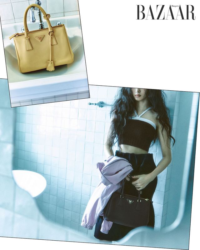 홀터넥 톱, 미디스커트, 손에 들고 있는 블루종 재킷, 미디엄 사이즈 ‘갤러리아’ 백은 모두 Prada. 수전에 걸린 미디엄 사이즈 ‘갤러리아’ 백은 Prada.