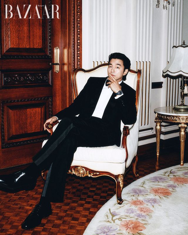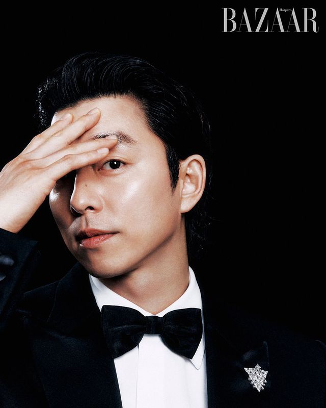 역삼각형 형태의 ‘퍼셉션’ 브로치, 화이트 골드 케이스와 선레이 다이얼, 돌핀 그레이 러버 스트랩이 특징인 ‘땅부르 타이코 스핀 타임’ 워치, 수트, 셔츠, 보타이, 슈즈는 모두 Louis Vuitton.