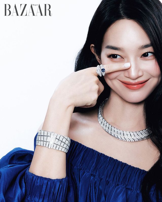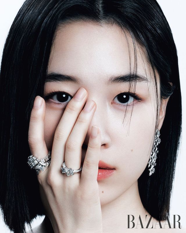 열 개의 모노그램 모티프가 연결된 ‘엘레강스’ 이어링, 검지에 착용한 ‘라 스타 뒤 노흐’ 링, 약지의 ‘뚜아 에 무아’ 링, 나베트 컷 다이아몬드와 브릴리언트 컷 다이아몬드가 조화를 이룬 ‘갤럭시’ 브레이슬릿, 드레스, 벨트는 모두 Louis Vuitton.