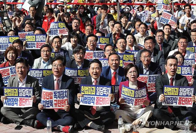 무대 앞에 모여 앉은 당원들은 스크린에서 '대법원장 사퇴' 등을 요구하는 민주당 의원들의 발언을 담은 영상이 재생되자 고성과 욕설을 퍼붓는 등 격분하는 모습을 보이기도 했다.